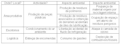 Podem também procurar fazer um fluxograma geral das actividades da empresa, listando as várias etapas: o que acontece desde entram as matérias-primas, até que sai o produto acabado? Depois, associar a cada etapa os aspectos e impactes ambientais.