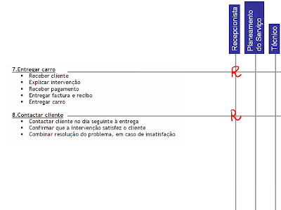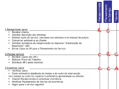 Agora, com o fluxograma e com o texto da entrevista podemos redigir a descrição das actividades que fazem parte do processo e atribuir um grau de intervenção a cada uma das funções intervenientes (R – responsabilidade; A – autoridade; C – colaboração).