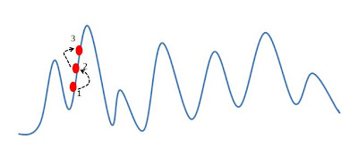 However, search processes tend to be sensitive to the topography of the solution space in a stronger sense as well. The particular extreme value that is identified by a given algorithm is typically sensitive to the initial proposed solution at which search started. Furthermore, the extreme value that is identified will be (or quite close to) a local peak in the solution space.