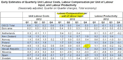 Pergunto: Não faz mais sentido interpretar o aumento da "Labour Compensation per unit of labour input" como uma consequência da manutenção dos salários (nem falo aqui na questão dos subsídios de Natal) e na redução da quantidade de horas trabalhadas? Há vários sectores de actividade que chegam a ter 15 dias de paragem na altura do Natal e do Fim de Ano.