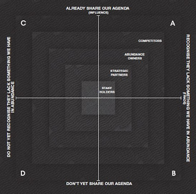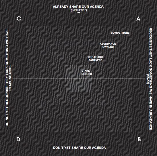 They recognized the opportunities inherent in constraints. It's this positive mindset coupled with a simple, repeatable method that gives improvisers and transformers the confidence to know that they can make something out of very little every time. They see offers everywhere. So when faced with apparent scarcity and constraints, we need to find and build new value in what we have, no matter how meager it may initially appear to us. And we need to understand how to trade this value with other parties [Moi ici: Aprender a pensar a nível de ecossistema e em relações ganhar-ganhar-ganhar] in order to get what we want, in the way improvisers trade offers to get a story. What can we offer them in exchange for what we need and they have in abundance? What might we do together that could have more impact than what we can do alone? How might we combine limited resources with others to create collective abundance?"