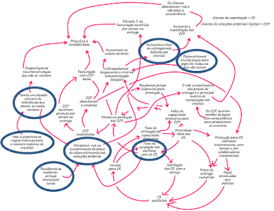 Como nos atrasamos na produção das nossa peças da nossa marca, que serão vendidas aos clientes de colecções próprias (CCP) -> os CCP ficam insatisfeitos -> os CCP decidem deixar de trabalhar com a empresa -> o que liberta capacidade produtiva interna para prestar um melhor serviço aos CE -> o que leva à produção de peças sem defeitos e dentro dos prazos -> o que gera CE satisfeitos -> o que gera mais vendas para CE e maior dedicação dos estilistas para com os CE -> o que rouba disponibilidade para tratar das colecções próprias e gera atraso na produção das nossas peças.
