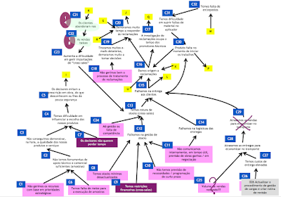 Agora, se recolhermos todas as causas-raiz e as combinarmos em grupos mais ou menos homogéneos, encontramos a matéria-prima para o desenvolvimento das iniciativas estratégicas. Ou seja, para melhorar o desempenho do indicador “% da facturação devolvida por atraso na entrega” (e outros, por efeito sinérgico, como por exemplo, o grau de satisfação dos clientes, a taxa de reclamações, …), há que desenvolver acções que ataquem: