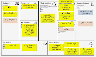 Neste caso, comecei o canvas pela proposta de valor, o que é que o J. pode oferecer? Aquários "plantados", hitec (acho que é isto que chamam quando há introdução de CO2 num aquário), verdadeiras obras de arte. Para quem, quem serão os clientes, particulares entusiastas deste tipo de aquário e lojas que podem servir de intermediários para a venda de aquários, para a venda das combinações de fertilizantes feitas pelo J., que podem organizar workshops onde o J. pode lançar mais gente na arte, que podem servir de ligação com clientes que precisam de manutenção planeada (negócio de subscrição) ou manutenção de emergência (por exemplo, salvar um aquário da invasão de algas). Como se vê, tem claramente potencial para ser mais do que um hobby, tais as fontes de rendimento que se descobrem sem grande reflexão.