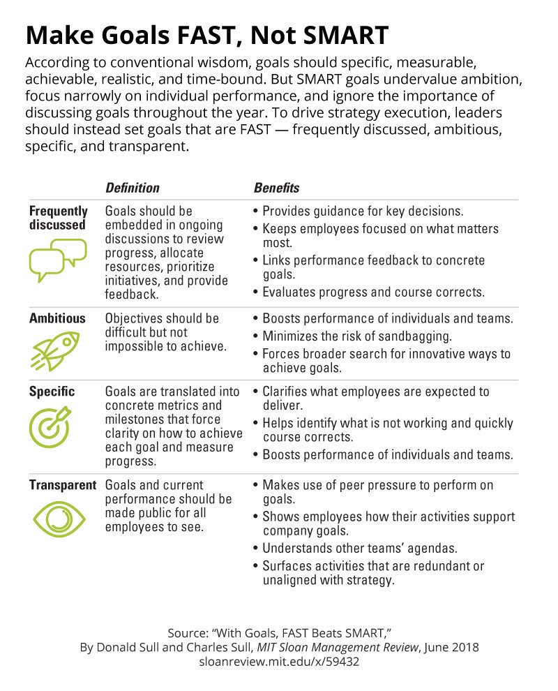 "According to conventional wisdom, goals should be specific, measurable, achievable, realistic, and time-bound. But SMART goals undervalue ambition, focus narrowly on individual performance, and ignore the importance of discussing goals throughout the year. To drive strategy execution, leaders should instead set goals that are FAST — frequently discussed, ambitious, specific, and transparent.Trechos retirados de "With Goals, FAST Beats SMART"