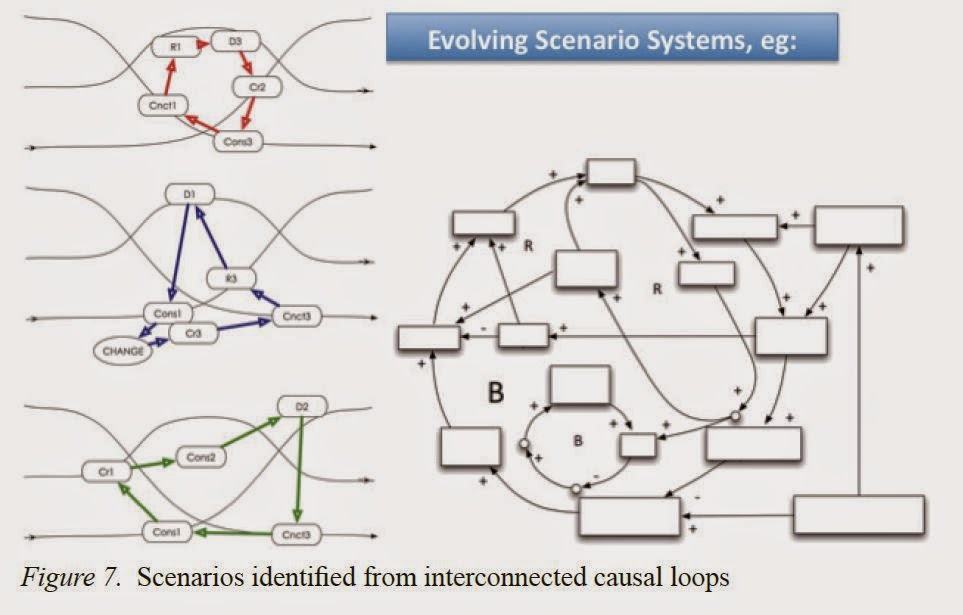 "From simple causal loops, participant discussion builds more complex system maps, portraying (in this case) three distinct dynamic systems creating different potential outcomes for the global business environment over the next ten or so years."Não pude deixar de fazer a ligação com a técnica que utilizo "assistia do seu acampamento, amedrontado, acobardado, aos desafios arrogantes do gigante Golias e..."