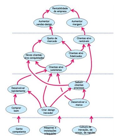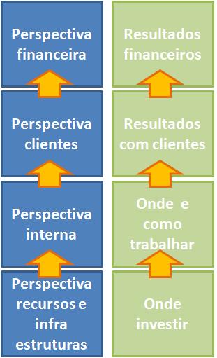 - Na base de um mapa da estratégia, na perspectiva de Recursos e Infraestruturas sistematizamos objectivos sobre os investimentos que temos de fazer. Depois, na perspectiva Interna listamos os objectivos que queremos atingir com o nosso trabalho, com o desempenho dos processos críticos da organização. A partir daí, proponho que nas perspectivas de Clientes e Financeira se utilizem apenas objectivos que meçam resultados, que avaliem as consequências do que fizemos nas duas perspectivas anteriores. Assim, as iniciativas actuam sobre os processos e infraestruturas para produzir os resultados desejados nos clientes e por tabela nos resultados financeiros.